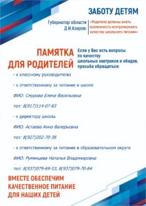 Ответственный от МБОУ «Школы № 134» г.о. Самара за питание: Смурова Елена Васильевна ( тел: 303- 25- 66, сот. 89171-14-07-83)